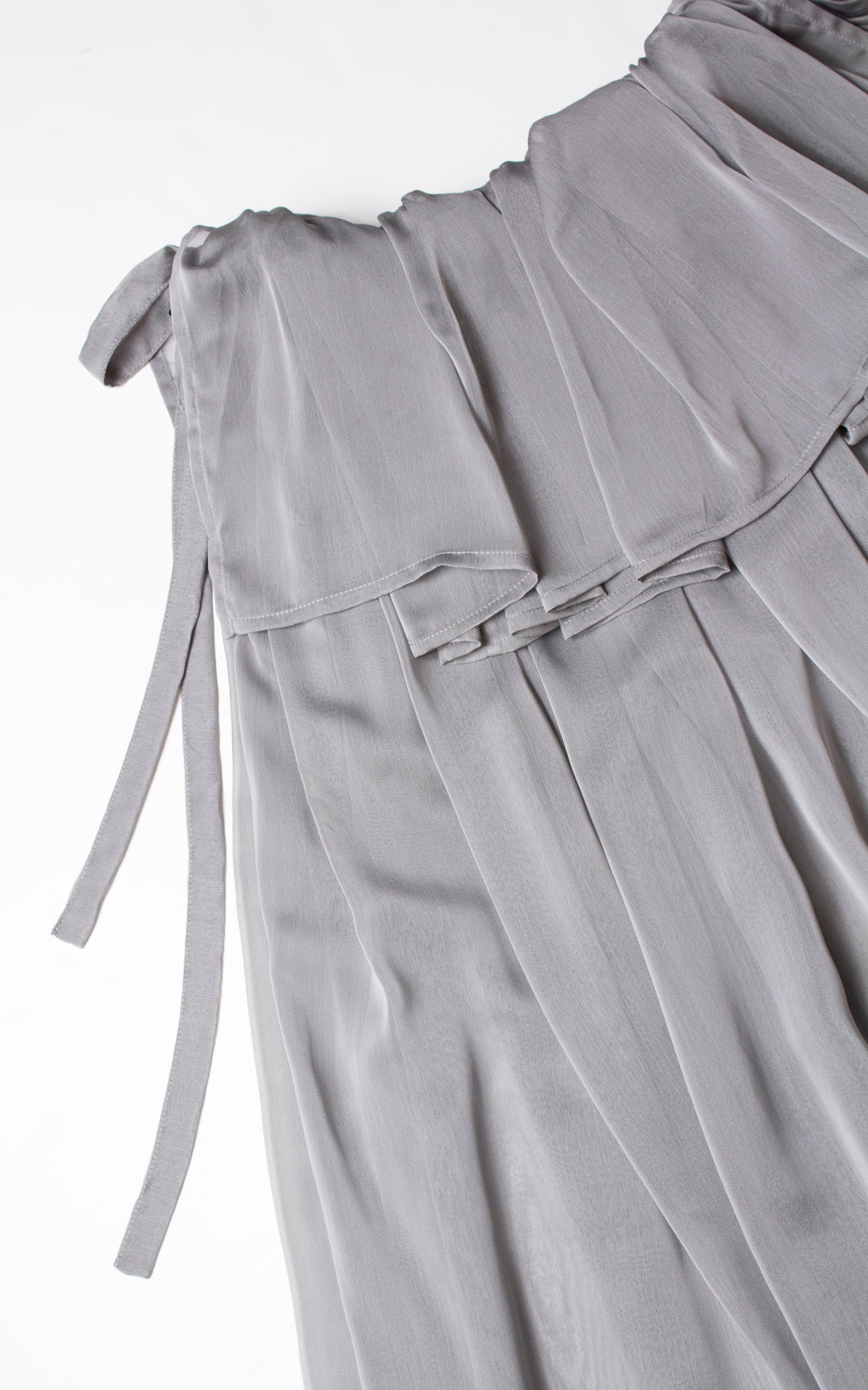 The Maria skirt in silver chiffon. Very translucent fabric but with enough coverage thanks to its double layer. This piece is ONE SIZE only, it can adjust to any size thanks to the adjustable ties in both sides.