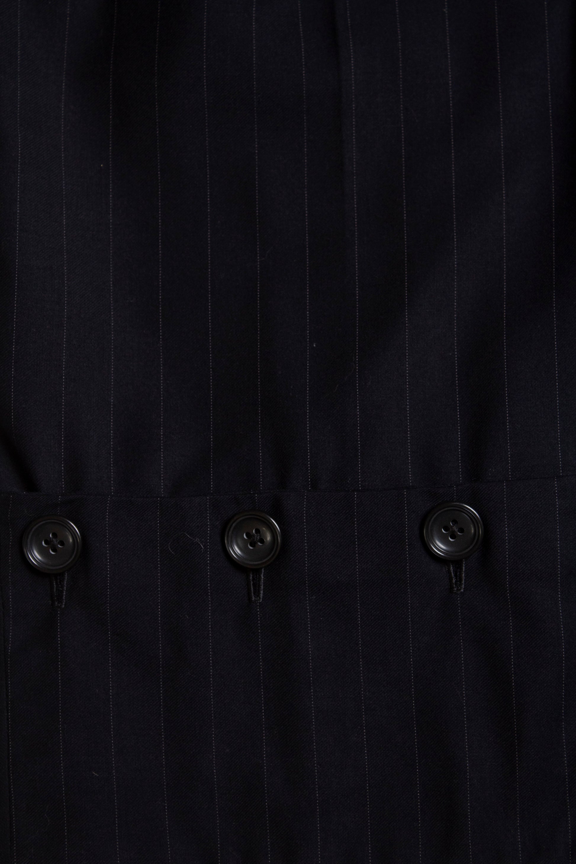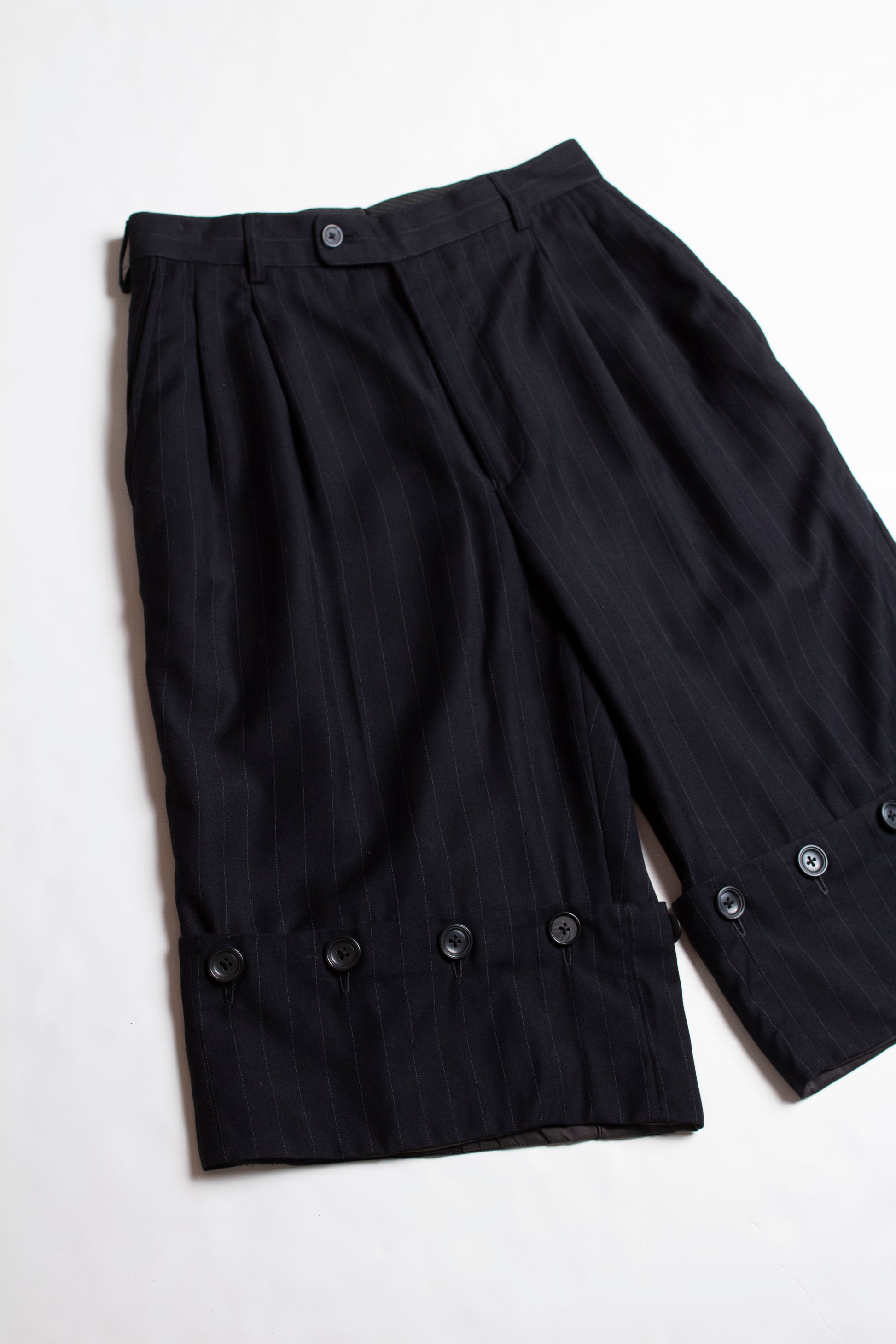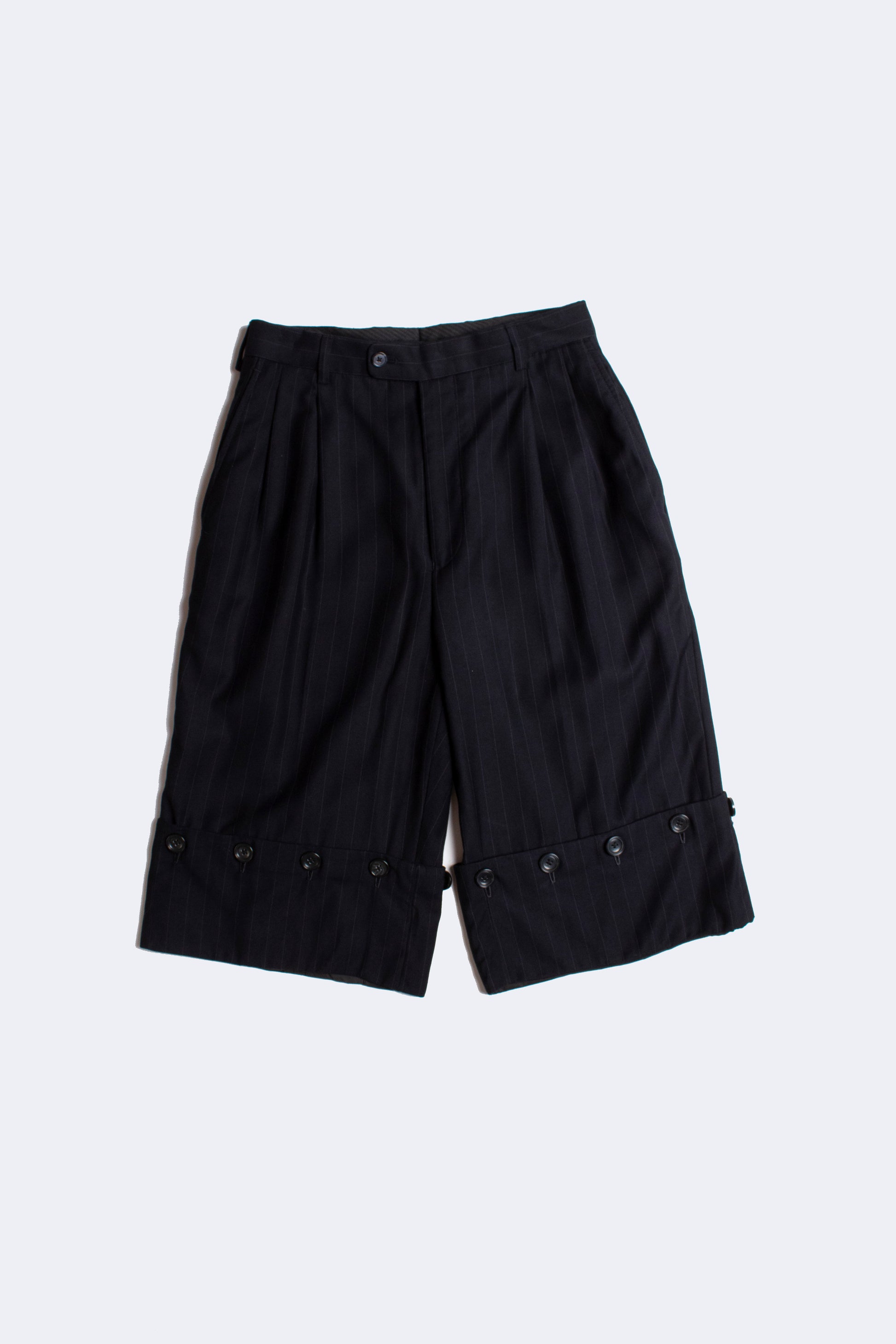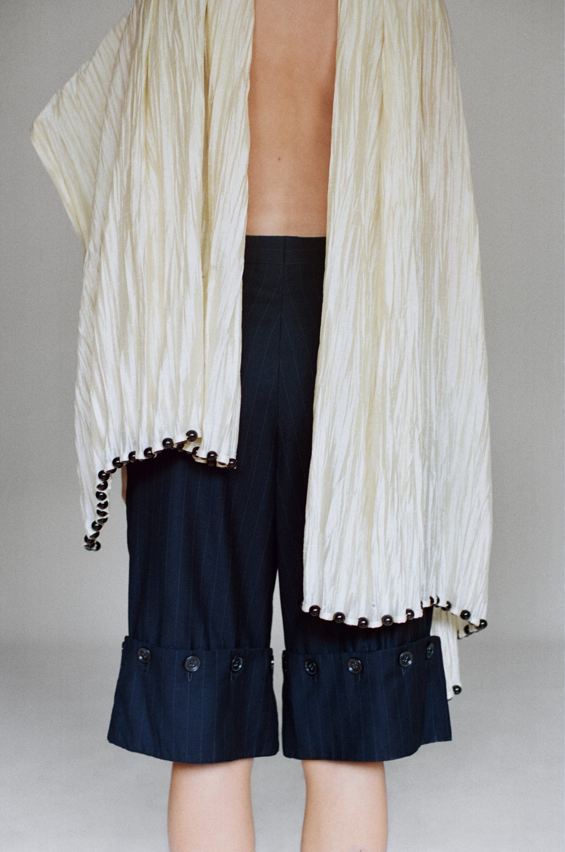 The Romeo Bermudas feature an exposed oversized hem that is attached with multiple buttons, you can transform this piece by taking the hem off and make the bermudas shorter. This pair comes in navy blue color with pinstripe.