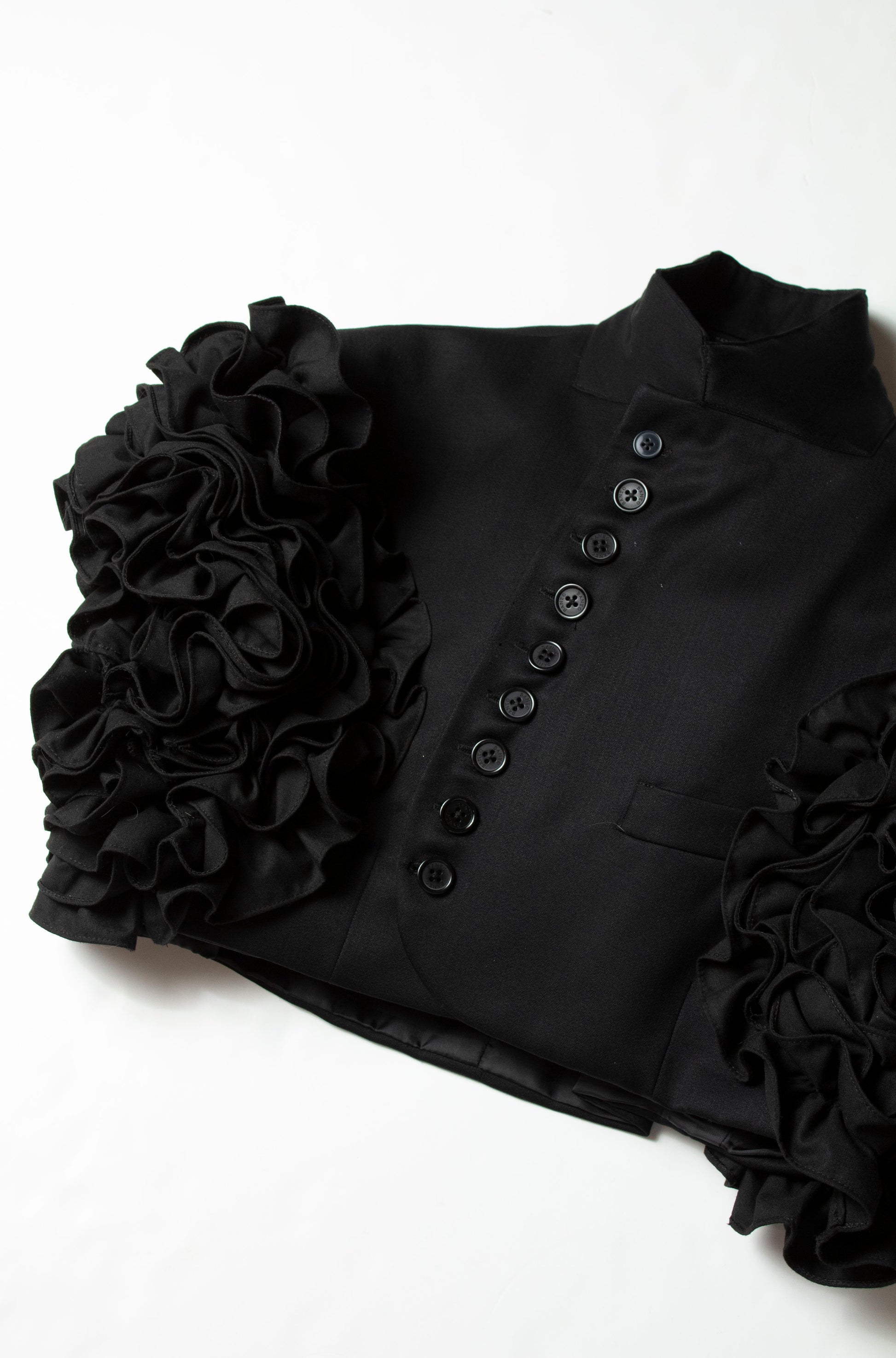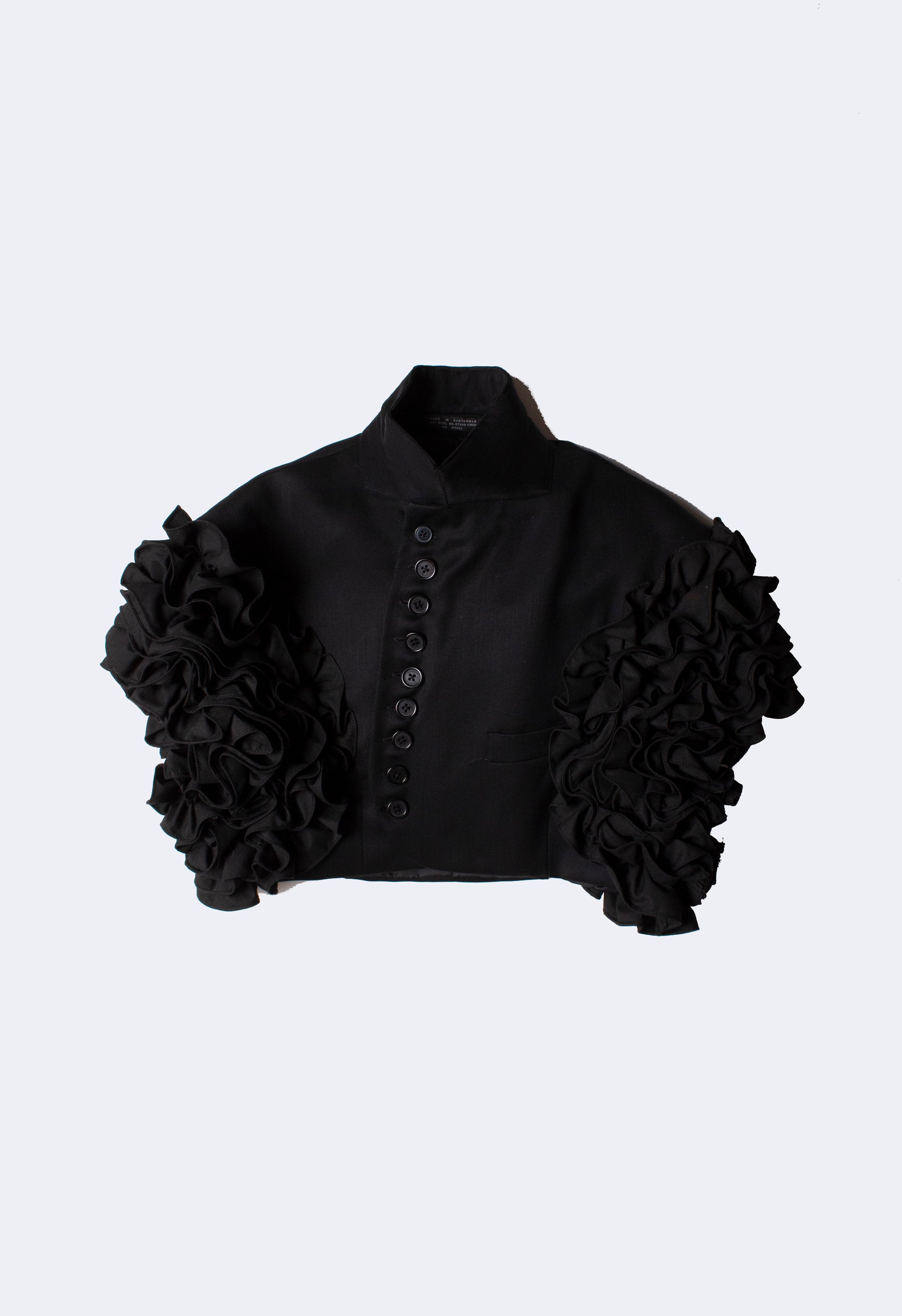 Our Rosa Bolero is made out of a pre-existing blazer jacket transformed through the practice of up-cycling. This short jacket adorned with casimir ruffles along the shoulders.